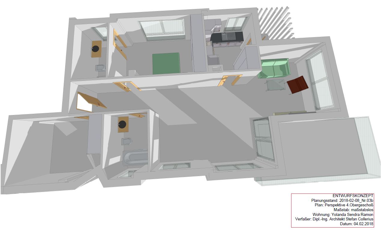 Design und Konzept eines „Komfort-Appartements“ mit der Entwicklung und dem Entwurf (Architekt Dipl.-Ing. Stefan Collerius) verschiedener Raumstudien für eine spanische Auftraggeberin. Innerhalb der statischen Gebäudestruktur wurden verschiedene Grundrissvarianten mit diversen Raumgrößen / -zuschnitten entwickelt.